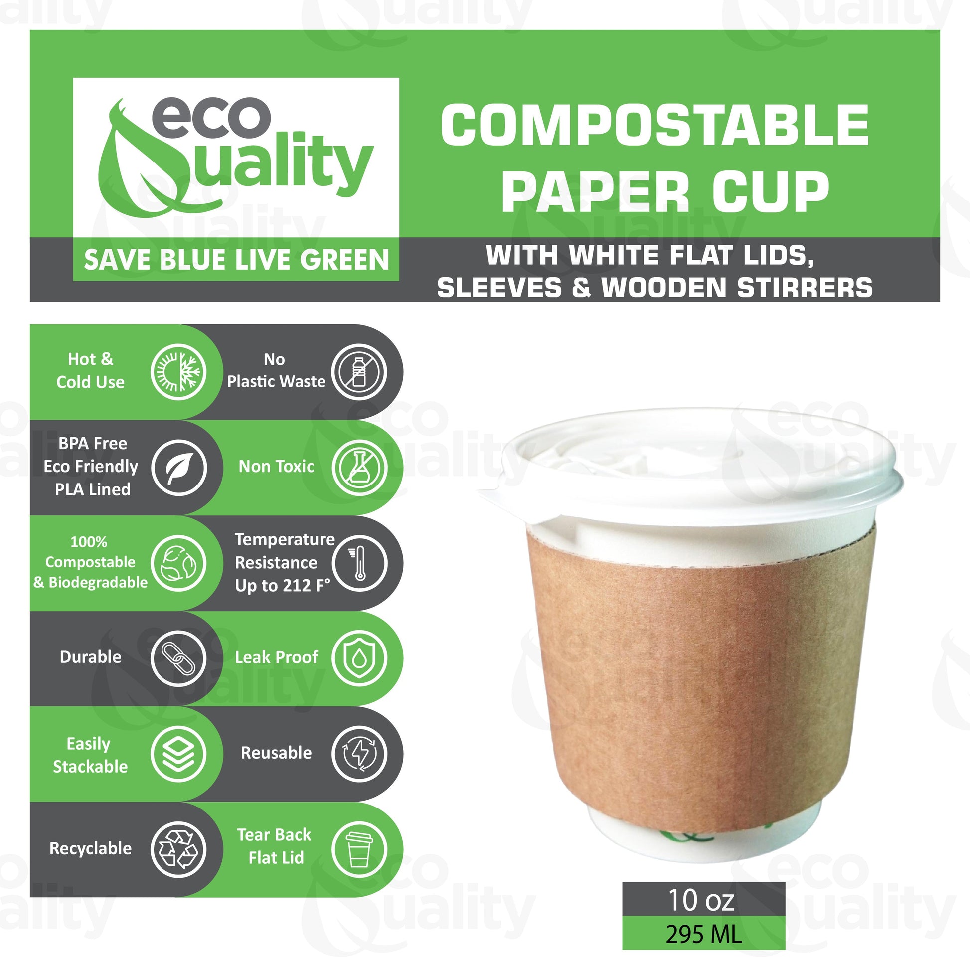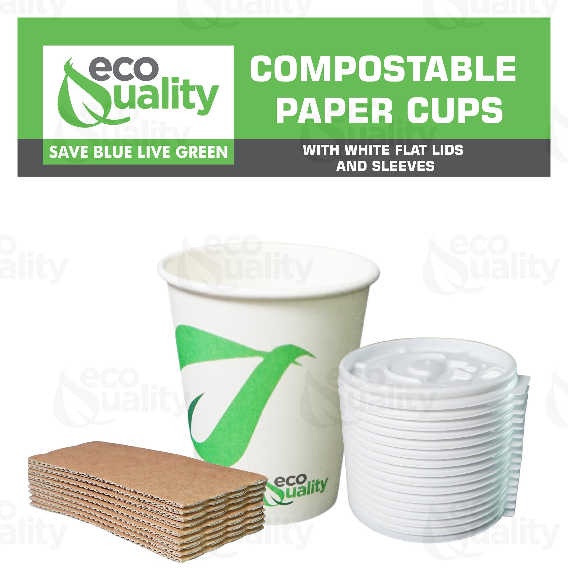 EcoQuality Branded hot paper tea cups are lined with a sustainable plant based starch. Which makes this cup a guilt free option, 100% natural and sustainable. Can be composted in a commercial facility. The perfect alternative to traditional plastic and wax lined paper cups.