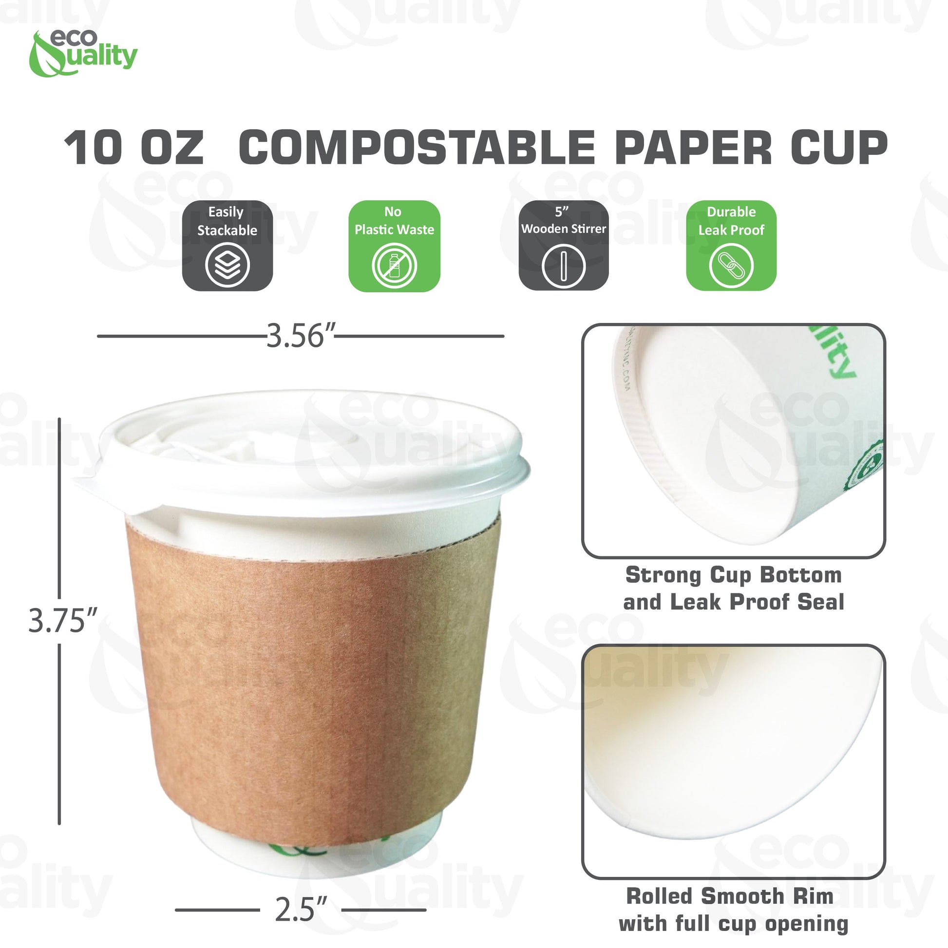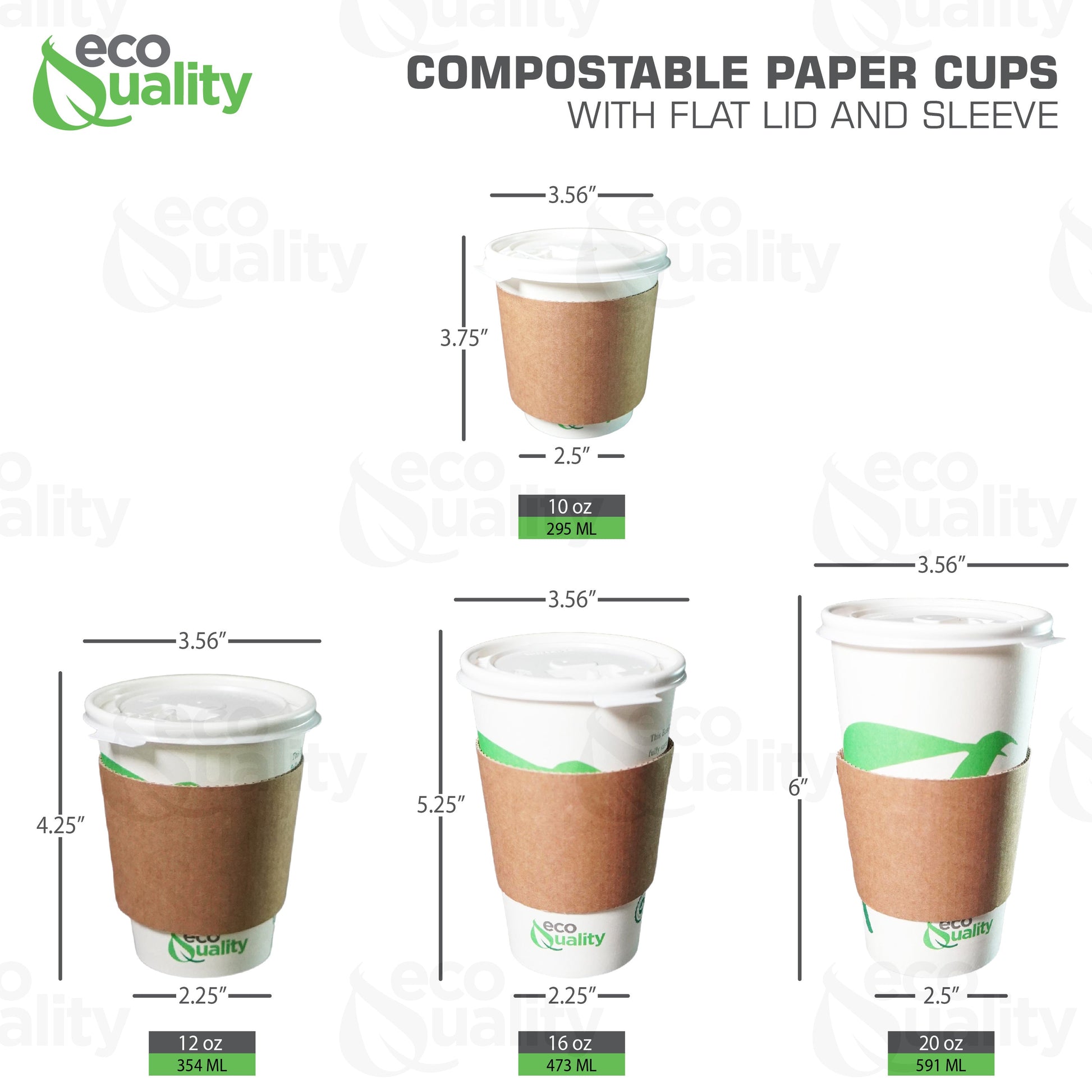 10oz Disposable Compostable Biodegradable White Paper Coffee Cups with Flat Lids and Sleeves