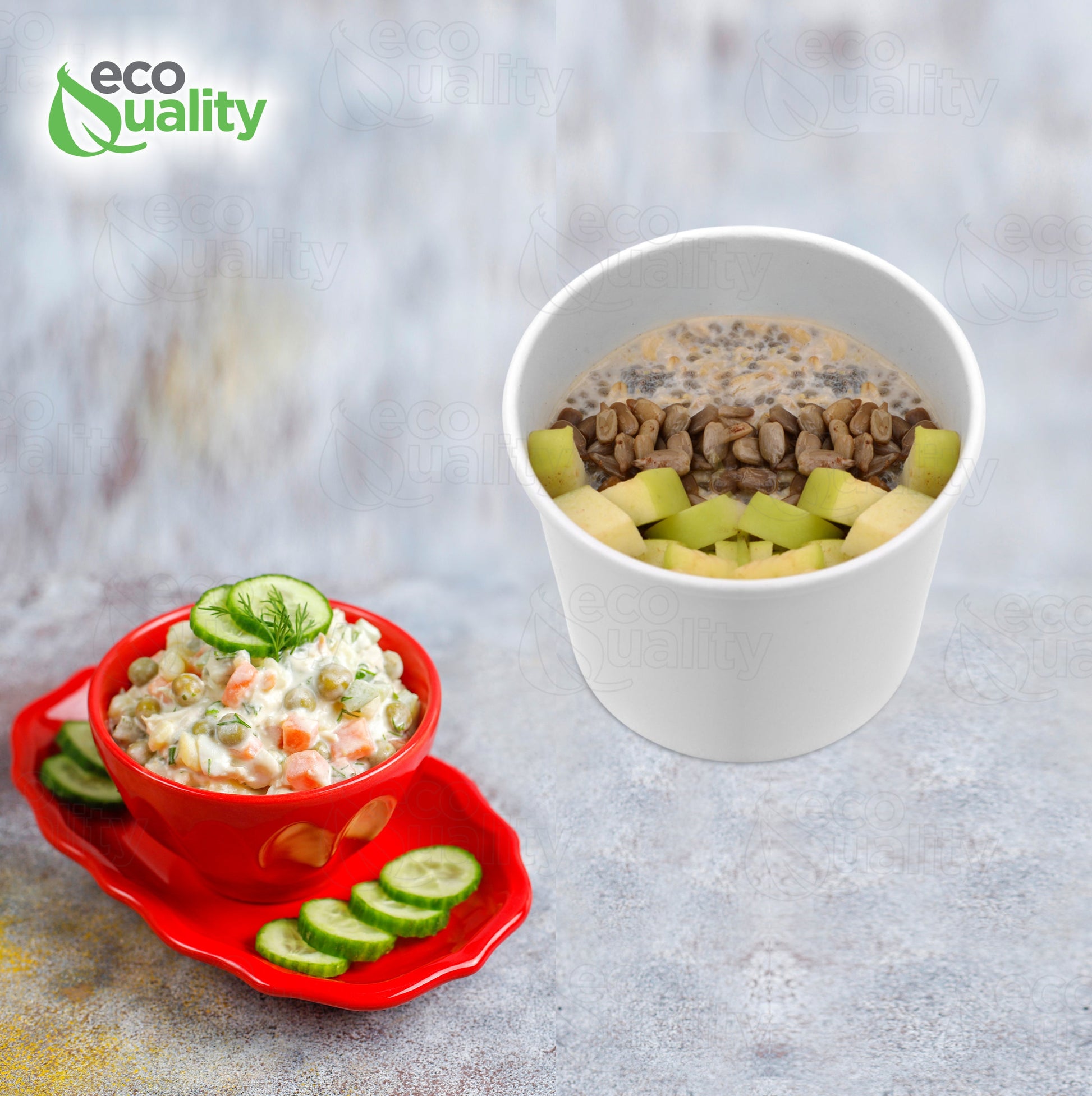EcoQuality Disposable White Kraft Disposable Paper Soup Cups great for many businesses such as ice-cream shops, salad bars, deli stores or supermarkets to provide presentation for take-out hot or frozen food. Made from double poly-coated paperboard, use this container to serve your favorite soups or stews, specialty frozen ice creams or yogurt, or your most popular hot side dishes and salads. The vented paper lid that lets hot, moist air out, before it becomes stuck within the container.
