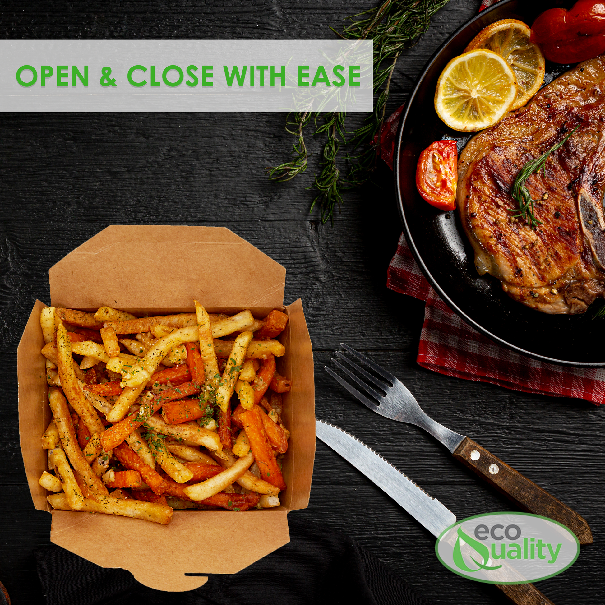 EcoQuality Disposable Paper Take Out Food Containers are made out of environmentally-friendly Kraft paper, ecologically sustainable materials. Containing Smart Design to provide a sharp look and upscale image these boxes are Stackable and the One-Piece design requires no assembly or lid inventory.