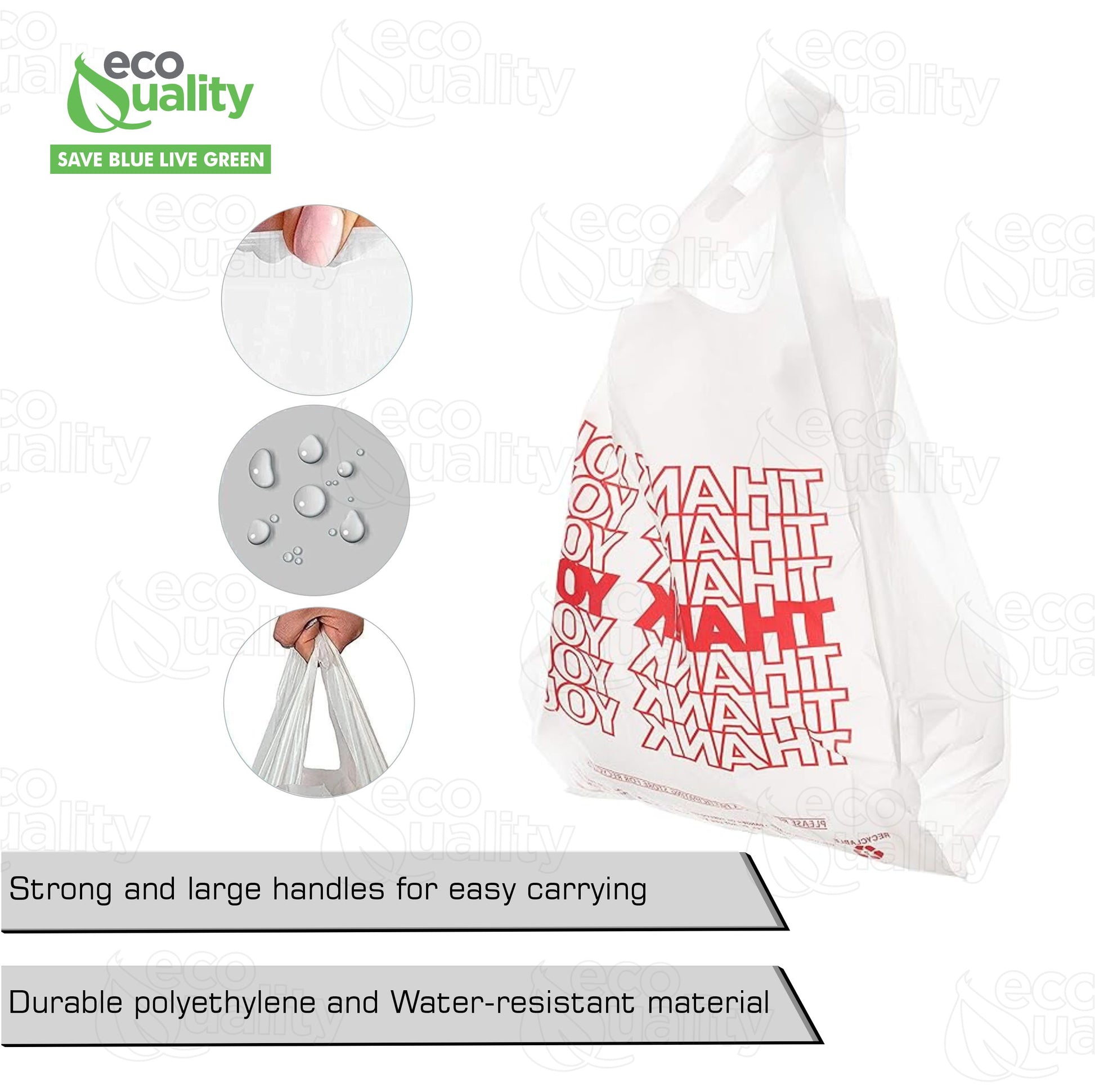 Medium 1/ 8 Plastic White Thank You T-Shirt Bags, 17" x 6" Reusable Recyclable Shopping Bags
