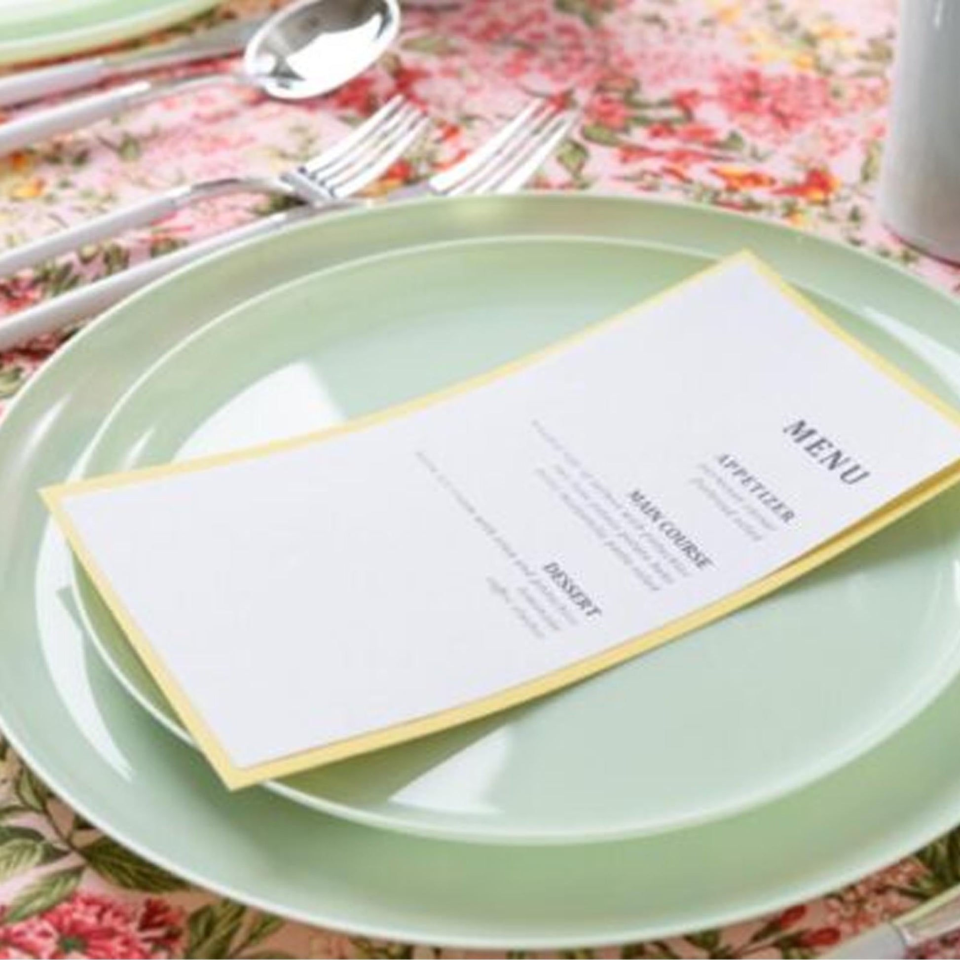 This Mint Green Edge Collection elegant dinnerware party collection is great for all occasions . You can serve great family dinners, birthdays, celebrations, weddings, receptions, baby showers, banquets, Thanksgiving, Halloween, Christmas, Family celebrations, Business dinners or any where you want your guest to feel welcomed. Our plates feel and look like glass china without the worry of cleaning and breaking. Easily dispose by throwing in your recycling bin or hand wash and reuse!