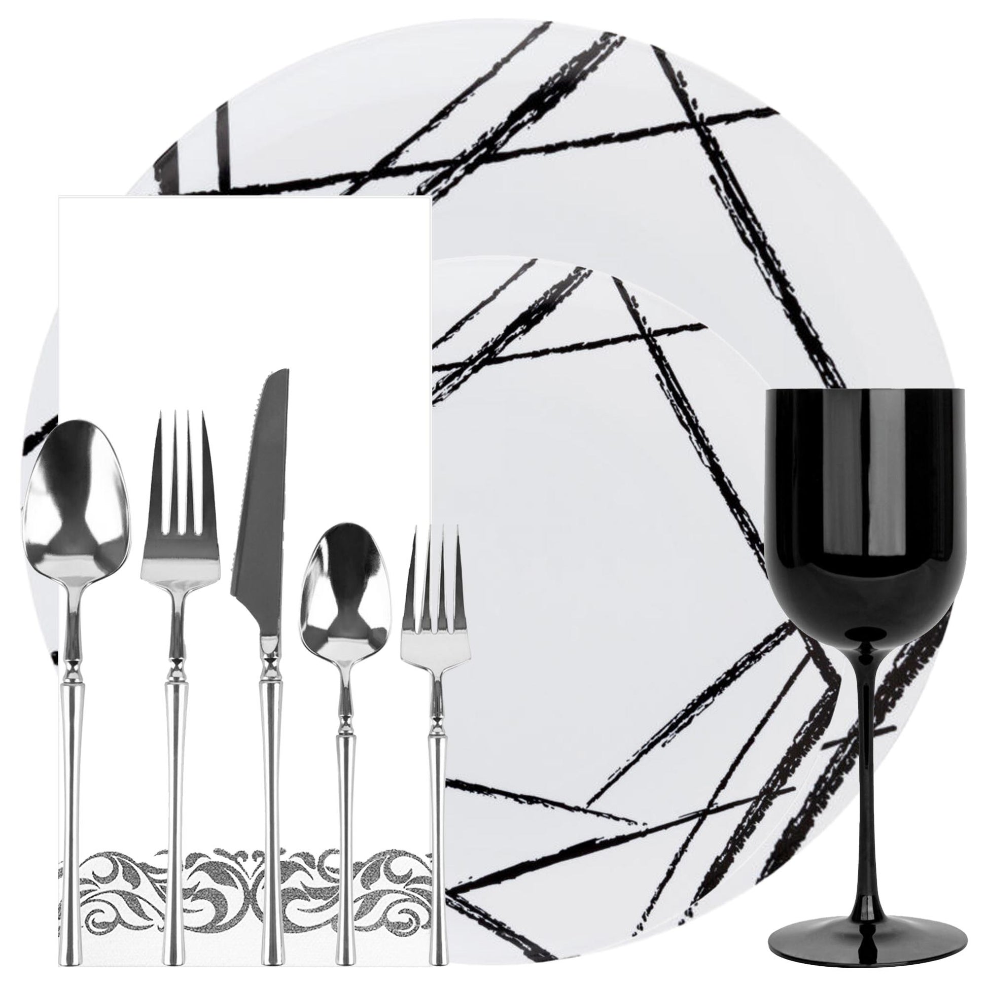 This Black Brush elegant dinnerware party collection is great for all occasions . You can serve great family dinners, birthdays, celebrations, weddings, receptions, baby showers, banquets, Thanksgiving, Halloween, Christmas, Family celebrations, Business dinners or any where you want your guest to feel welcomed. Our plates feel and look like glass china without the worry of cleaning and breaking. Easily dispose by throwing in your recycling bin or hand wash and reuse!