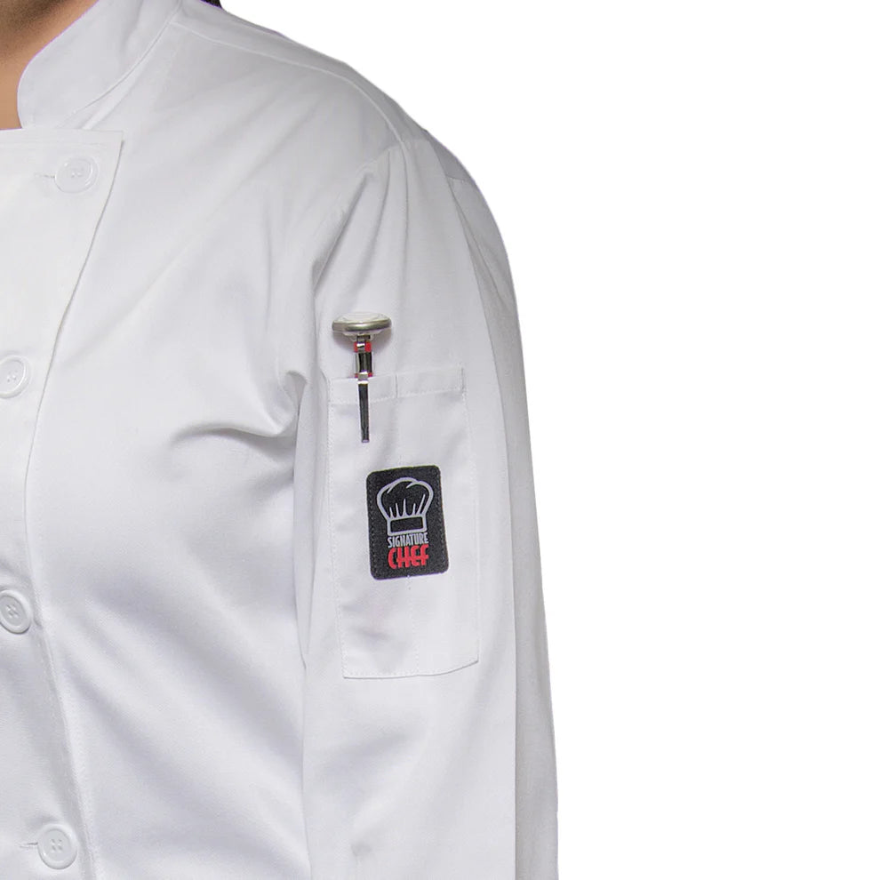 This stylish, professional women's chef jacket is designed to offer comfort, practicality, and elegance in high-demand kitchen environments. Crafted from a lightweight poly-cotton blend, the jacket combines breathability and durability, making it perfect for chefs working in upscale hotels, restaurants, and resorts. Available in black and white, this jacket provides a refined, double-breasted silhouette that complements any kitchen’s professional attire.